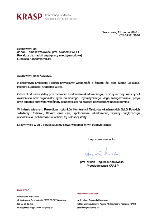 W imieniu własnym, Prezydium i członków Konferencji Rektorów Akademickich Szkół Polskich składamy Rodzinie, Bliskim oraz całej społeczności akademickiej wyrazy najgłębszego współczucia i solidarności w obliczu tej bolesnej straty. Łączymy się w żalu i przekazujemy słowa wsparcia w tym trudnym czasie.” – napisała prof. dr hab. Bogumiła Kaniewska, Przewodnicząca Konferencji Rektorów Akademickich Szkół Polskich (KRASP).