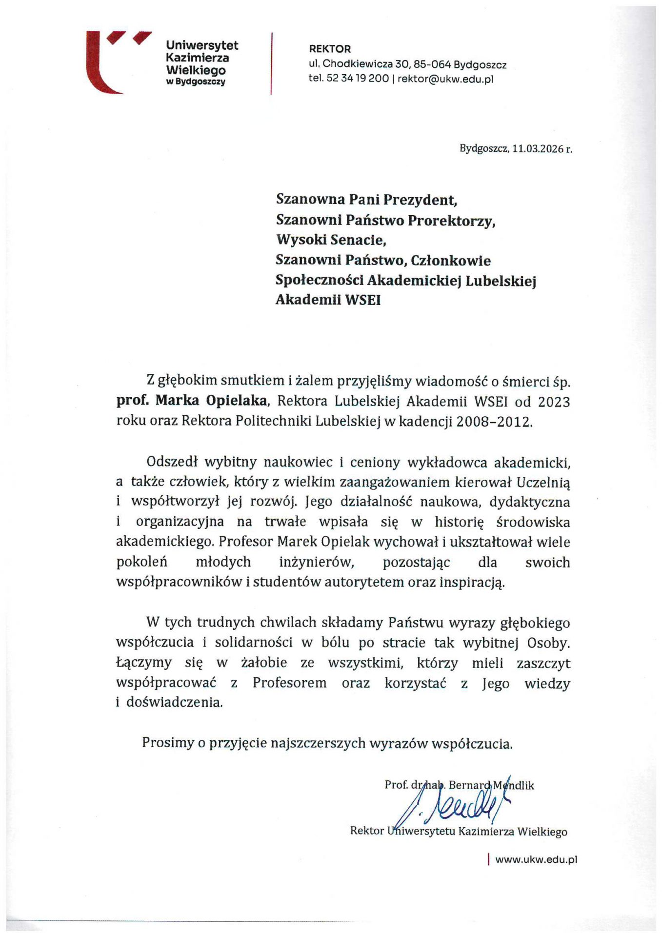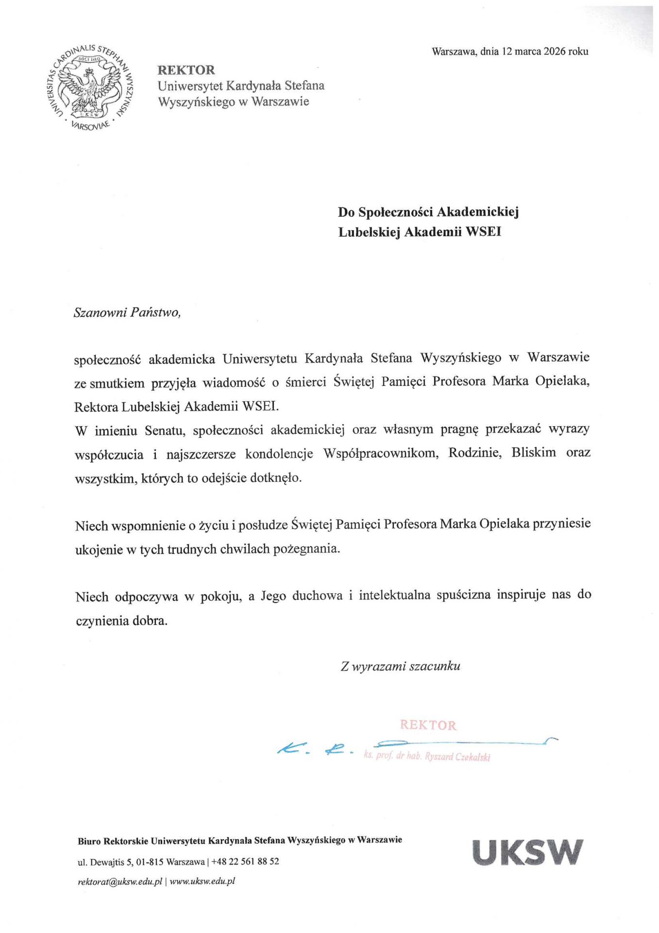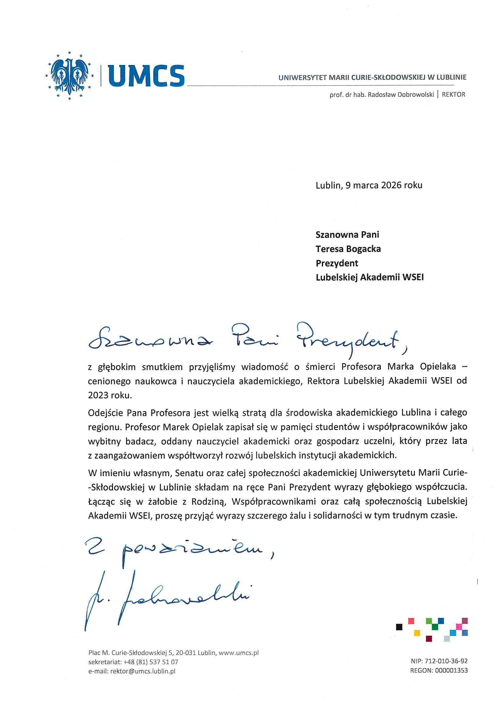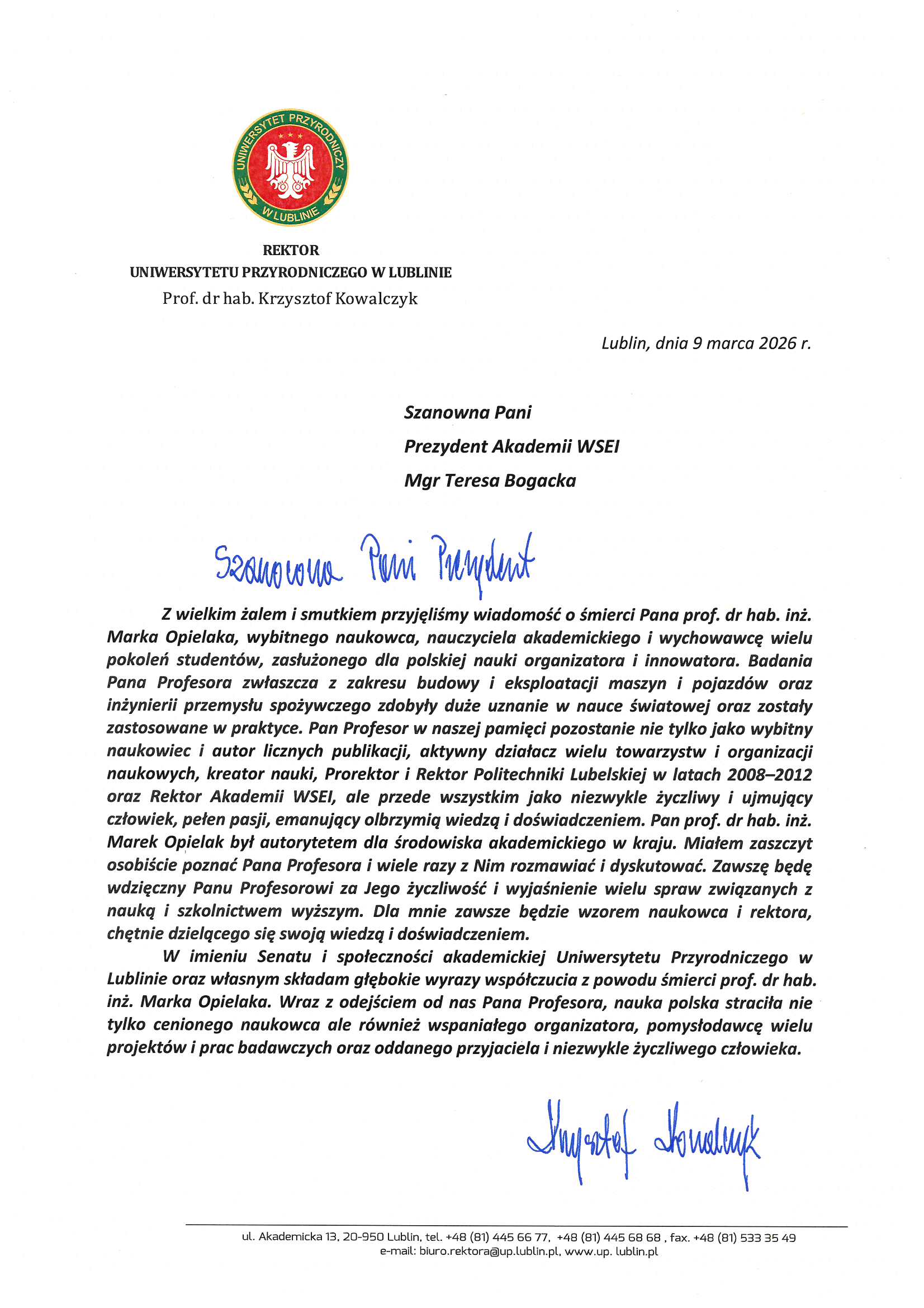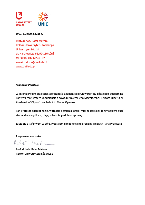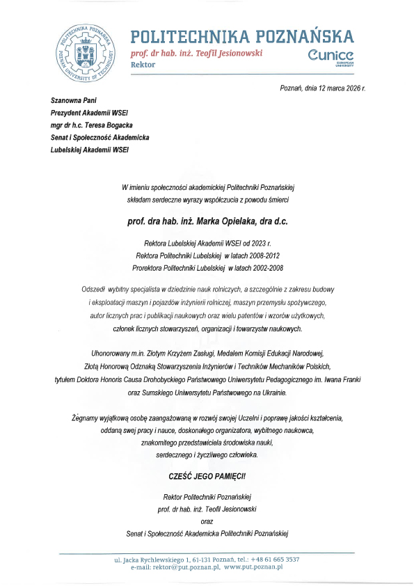 Z całego kraju, jak i zagranicy napływają kondolencje z powodu śmierci śp. JM Rektora Lubelskiej Akademii WSEI, prof. dra. hab. inż. Marka Opielaka, dra h.c.