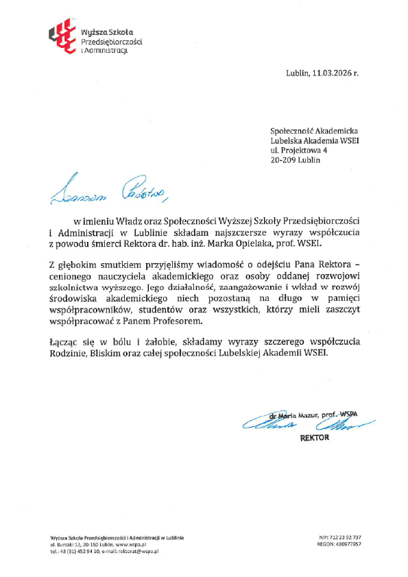 Dziękujemy za wszystkie nadesłane słowa wsparcia i otuchy po śmierci śp. Rektora prof. Marka Opielaka oraz okazane współczucie w tych trudnych chwilach. Jego nagłe odejście jest dla całej społeczności Lubelskiej Akademii WSEI ogromną stratą.